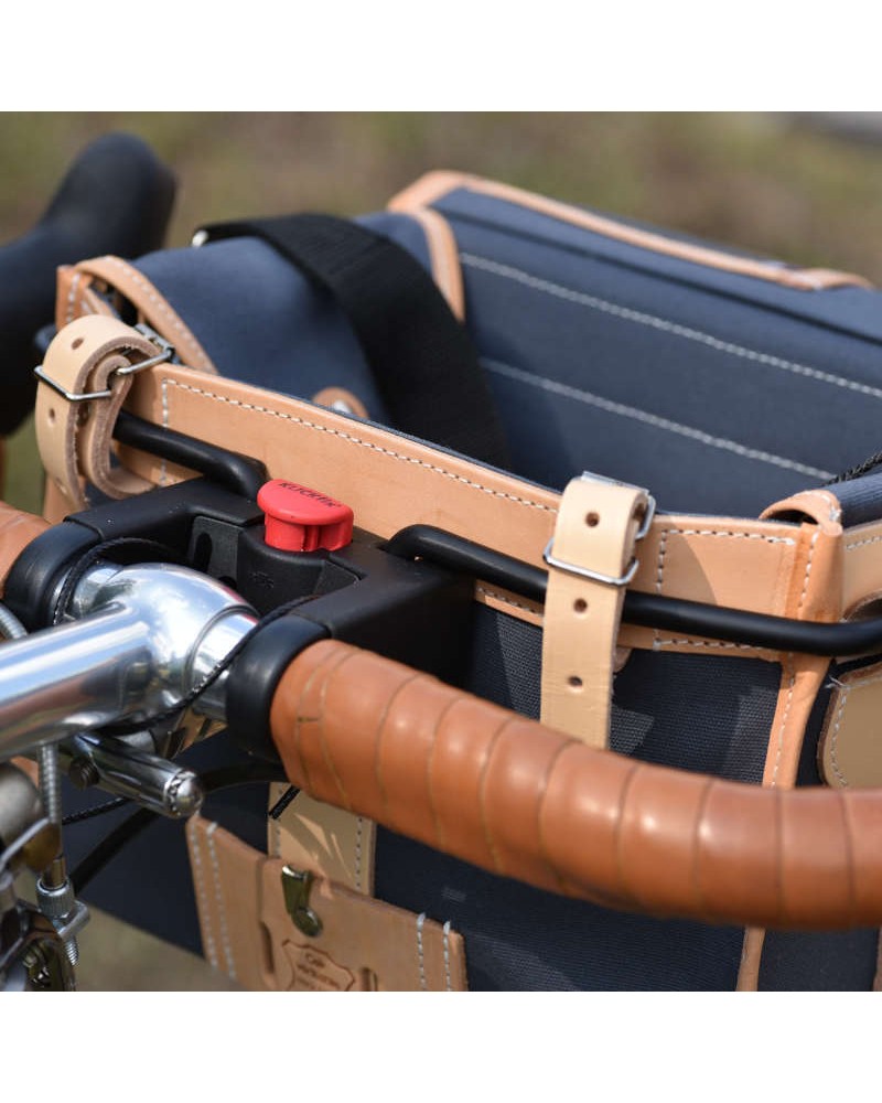 Wird mit zwei Lederriemen am Lenker oder besser noch mit einem "Décaleur" befestigt.