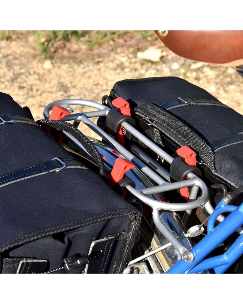 Pakkauslaukkujen pari, jossa on viisto kulma kantapään vapaana pitämiseksi. Suunniteltu siten, että ne sopivat lowriderin takatelineeseen.